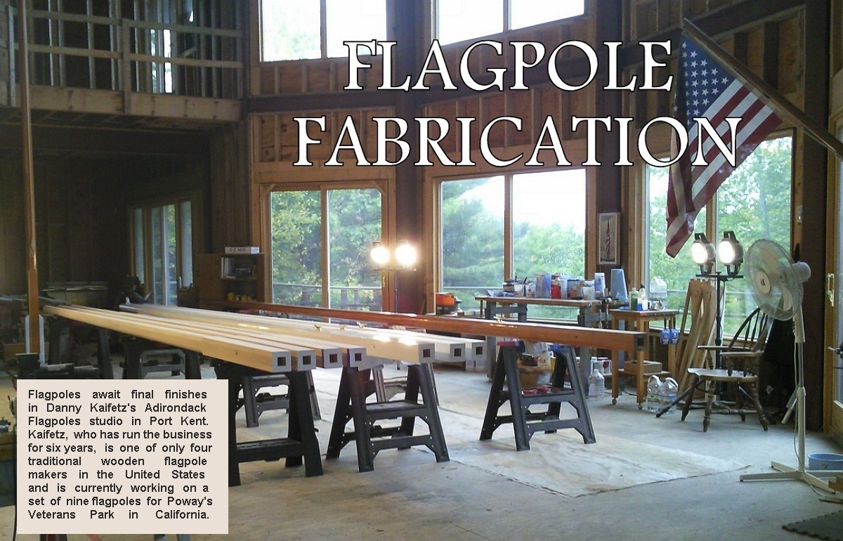 PORT KENT — Adirondack Flagpoles, a design center, workshop and office for Danny Kaifetz, a local craftsman, sits high on a promontory overlooking Lake Champlain. Kaifetz is now working on his 71st commission, a set of nine traditional wooden flagpoles destined for a revamped Veterans Park in Poway, an urban suburb of San Diego. The flagpoles are scheduled for delivery, intact and in perfect condition, by Nov. 1. The park will be rededicated on Nov. 11, Veterans Day. "I'm on a seven-day-a-week project," Kaifetz said. "I was asked to do it with only 35 days notice." Only four traditional wooden flagpole makers exist in the United States. Kaifetz was selected and commissioned for the project, an honor in his view. He sees the products made by his business as an indication of how many fine craftsmen work in the Adirondacks. Kaifetz opened Adirondack Flagpoles just six years ago. "There isn't a day that goes by that I don't recognize how fortunate I am to be doing what I'm doing," he said. "I'd spent years working in the forest-products industry and previously as a surveyor. I used my skills and knowledge of geometry and forest products and moved on to craft flagpoles." |